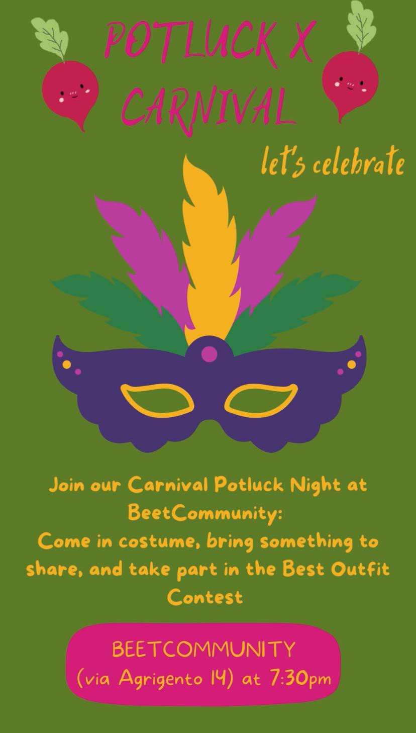 On Carnival night, we’ll gather to celebrate together with a special twist — a Carnival Potluck, where everyone brings something to share and enjoy as a community.